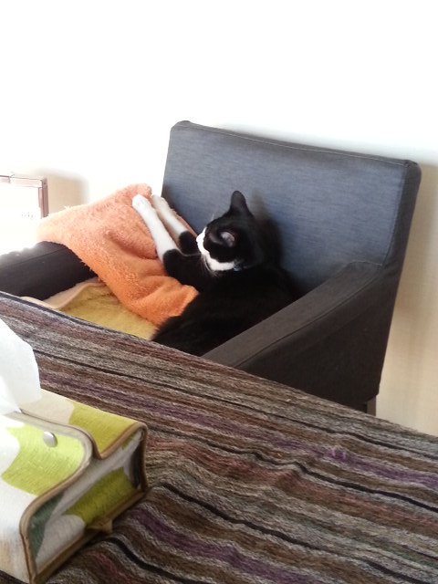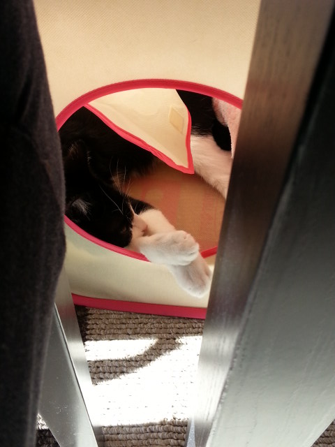 「ねこのきもち」の付録でもらったボックスでひと眠り。