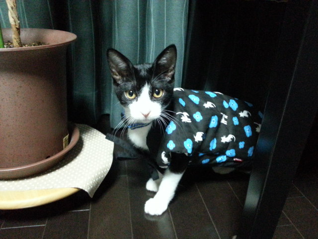 お洋服着てる犬はよく見るけど 猫に着せてみると・・・ いきなり固まる!とか、歩きがおぼつかない!とか~ いつの間にする~り脱ぎ捨てますよね。 する~り ^^