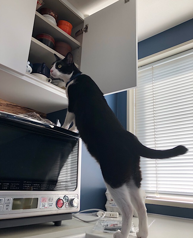 頑張れば一番上の棚にもとどくでェ。 やってみよか!?