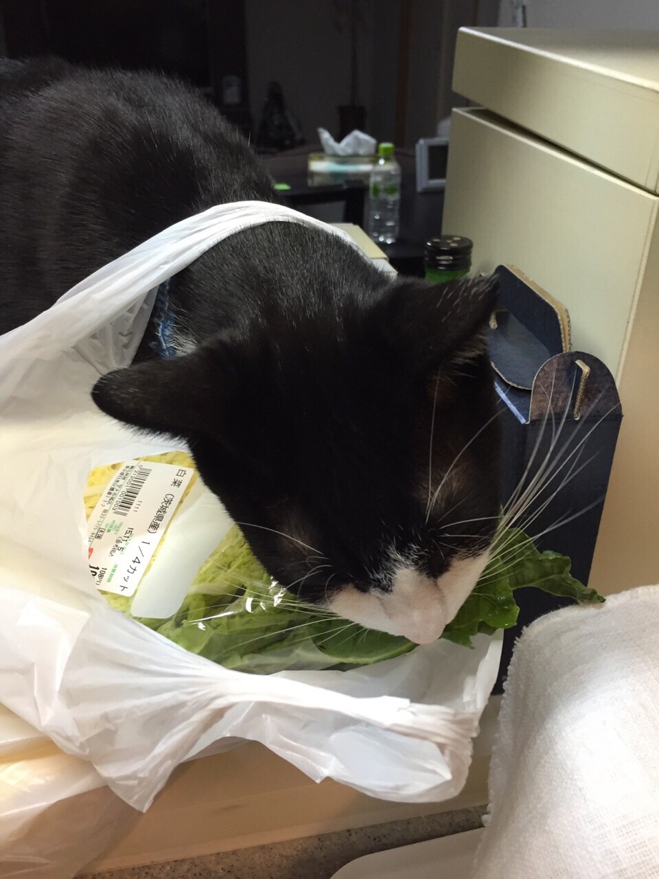 食べたいのかな~(*^_^*) 猫って必ずといっていいほど 袋の持ち手に頭入れますよね(笑)