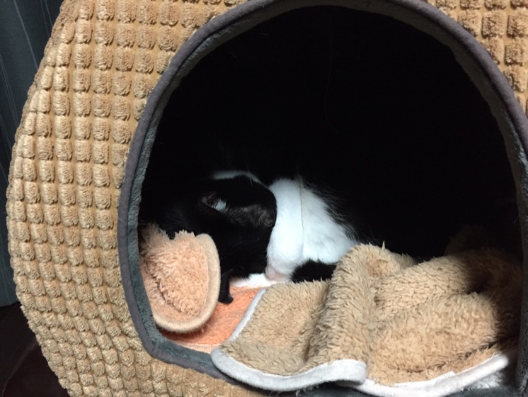 小屋に入って、頭を抱え込んで寝てる。