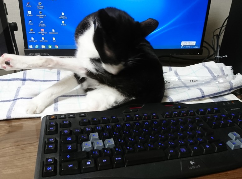 ウチと逆ですね! キーボードに乗ってしまうので 膝の上に抱えたままになります(>_<) みそちゃん、その敷物はみそちゃんの?