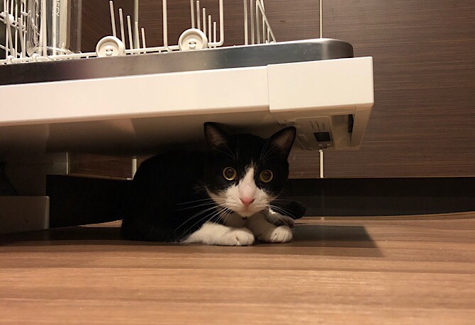 みそちゃん、どこ? 床と・・・食洗機の扉の間? まん丸お目目で何見てるのかな~? 可愛すぎなんですけどぉ~(●^o^●)
