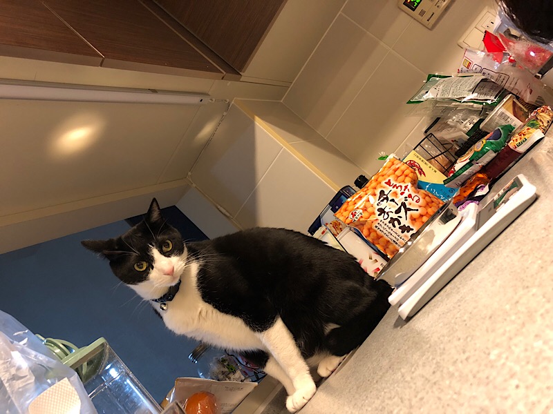 お行儀良く待っているなんて、紳士ですね♪ おばちゃんはみそちゃんの後ろにある とろけるチーズおかきが食べたいです