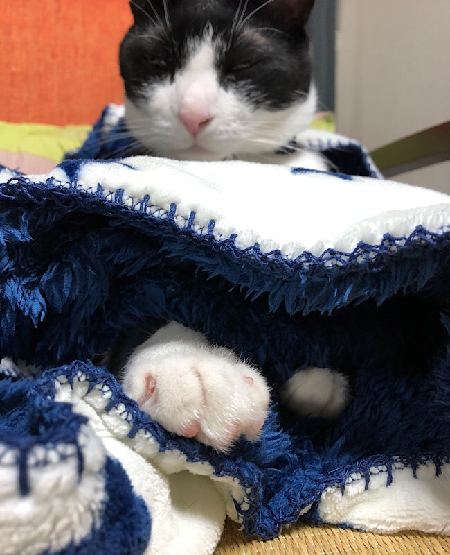 毛布被っていたところ暑くて手を出したところですね(ᵔᴥᵔ)親字面というより仏顔ですね(´∀`*)