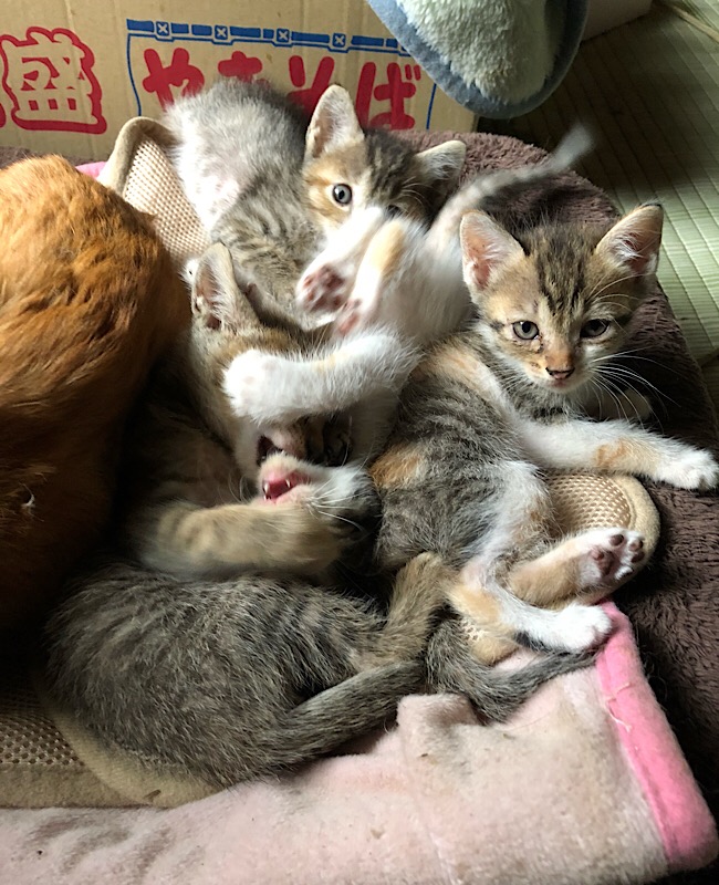 4にゃんかな? 可愛いですね~~~(*^^*) 茶猫は子育てのお手伝いしているんだろうか。 エライぞ! 茶猫