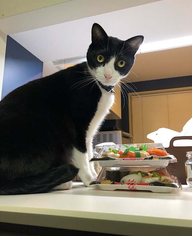 はっ??? ワシの目の前に置いといてワシのは あらへんて どうゆうこっちゃ。鬼か!! まあ、確かにサビは猫には毒やけど、 ワシのためにお刺身買うて来てくれるとか、気遣いはあらへんの? あのな、もうすぐクリスマス! プレゼント待ってるでえ〰〰〰