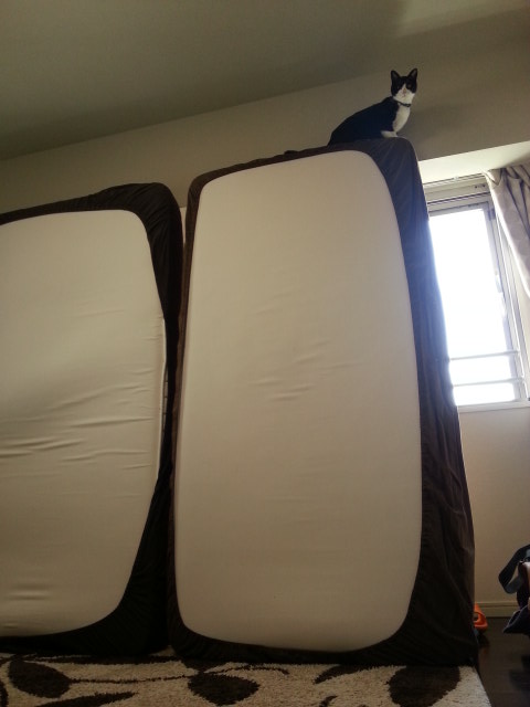 >ウチは掃除機をかけているときは冷蔵庫の上に避難しています。