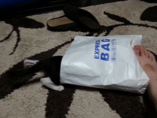しばらく見ていると恐る恐る袋への侵入を試みる。